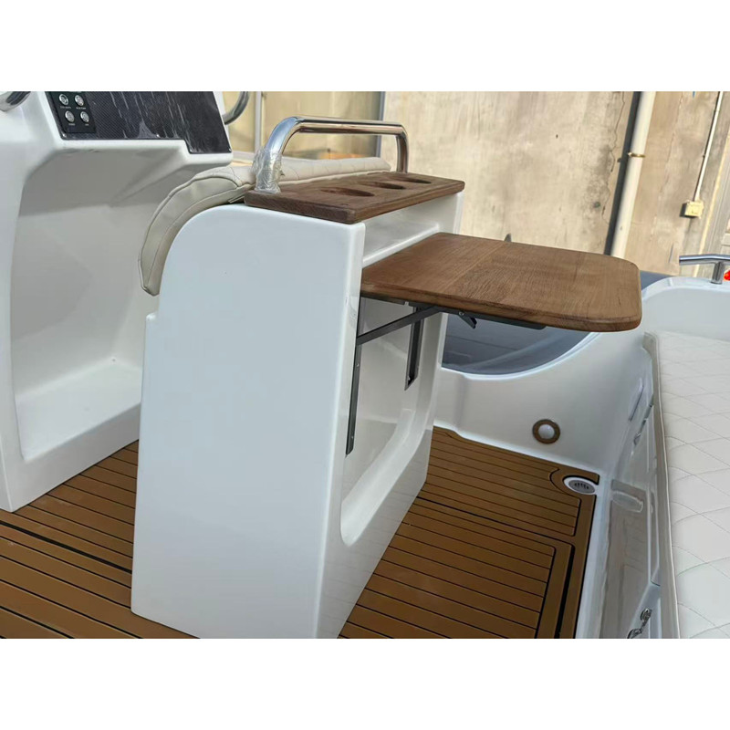 Rigid hull console rib RIB600 is one new model boat developed in 2023 with bigger boat width and luxury design. the console driven rib RIB600 provides enhanced strength and stability allowing it to navigate water conditions with ease The use of fiberglass ensures lightweight construction without compromising durability. For RIB600, It has complete accessories of 120L fuel tank, stainless steel roll bar with navigation lights, electric bilge pump,anchor holder, middle console, luxury middle seat with table and rear seat with seat cushion.Clients also could choose optional accessories such as windlass, teak floor, hydraulic steering system and etc.