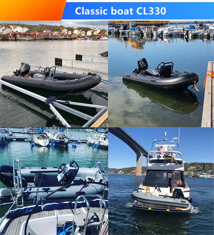 The small double hull tender sized of 300cm,330cm,360cm and 390cm. we call Classic boat. Classic boats are made of 2.5mm thick powder coated marine grade aluminum for boat hull and 1100 Dtex pvc fabric or 1.0mm hypalon fabric for inflatable tube. Best rigid hull inflatable boat and affordable rib boat CL330 has double flat boat hull and single front locker.